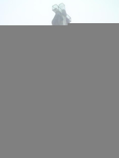 Ik moet bij Monte del Gozo zijn, maar dat heet hier allemaal zo en het duurt langer dan verwacht. Heuvel op en af en dan toch weer op! En dan opeens staat dat enorme monument daar bovenop de berg. Slierten mist kruipen er omheen. Een heel apart gezicht. Een vriendelijke mevrouw zonder ervaring neemt een foto van mij met mijn camera (veel te dichtbij). Er is een klein kapelletje waar ik mijn stempelkaart zelf afstempel (nog 3 lege vakjes op mijn tweede kaart - die zijn voor morgen!). Buiten staat een klein tentje waar je koffie en fris kunt kopen, maar ik wil nu wel graag mijn hotelletje vinden.